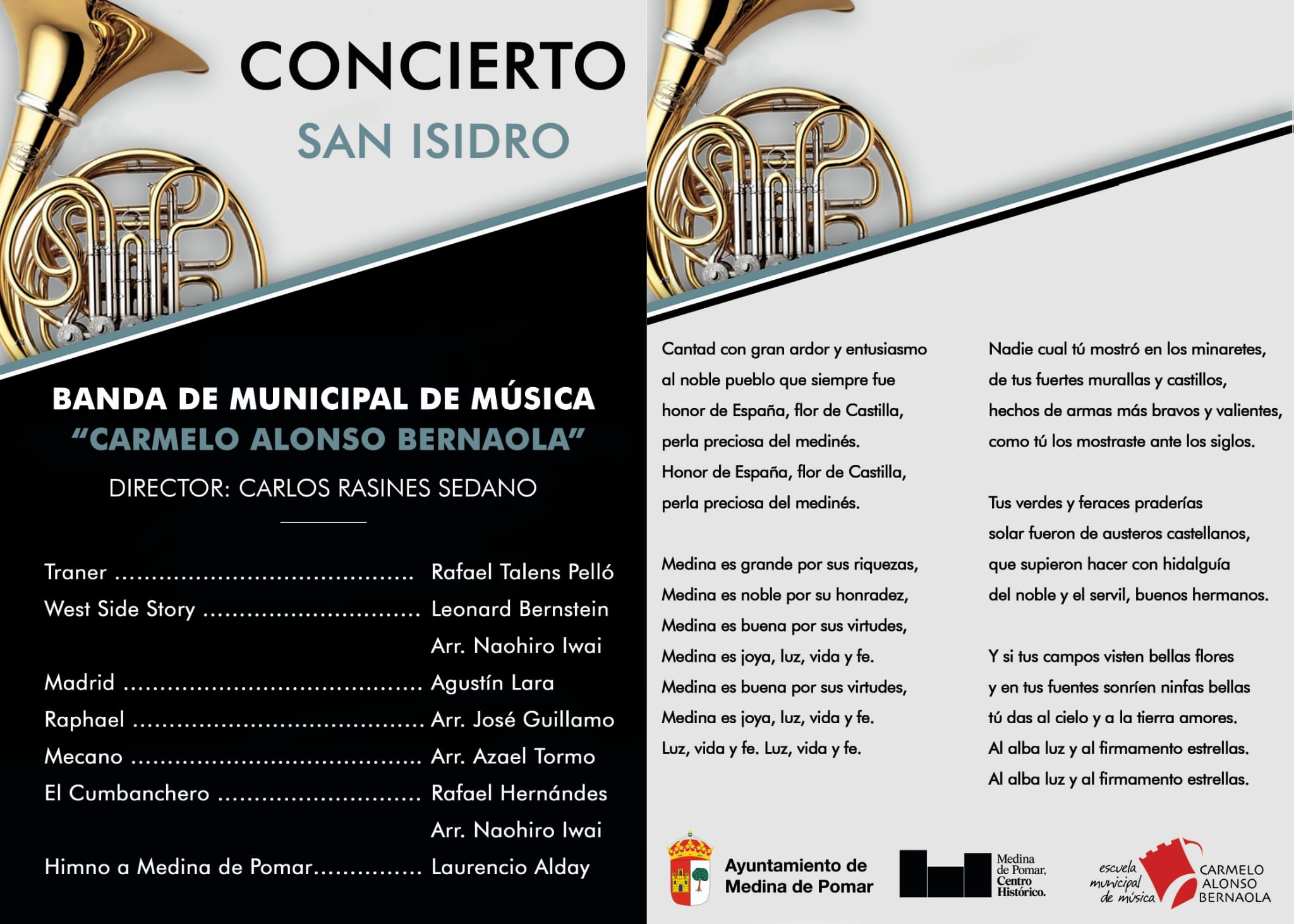Concierto San Isidro 15/05/2022 13:45 / 15:00 Plaza Mayor - Medina de Pomar, Plaza Mayor 3, Medina de Pomar Banda Municipal de Música Carmelo Alonso Bernaola. Director: Carlos Rasines Sedano. Al finalizar, interpretación del Himno a Medina.