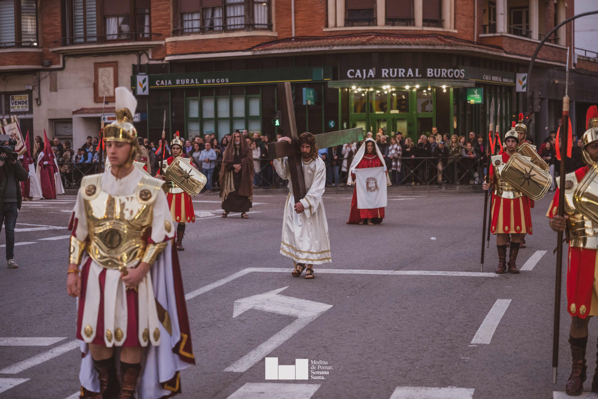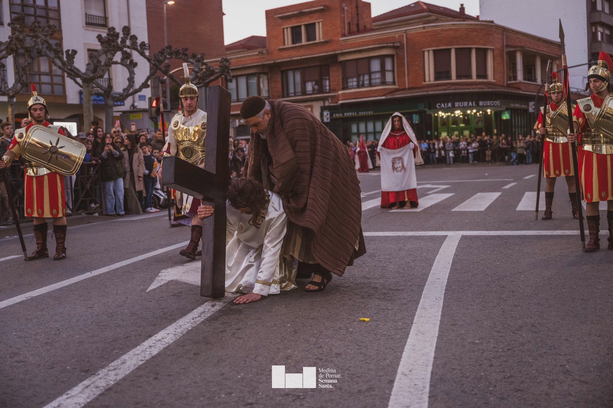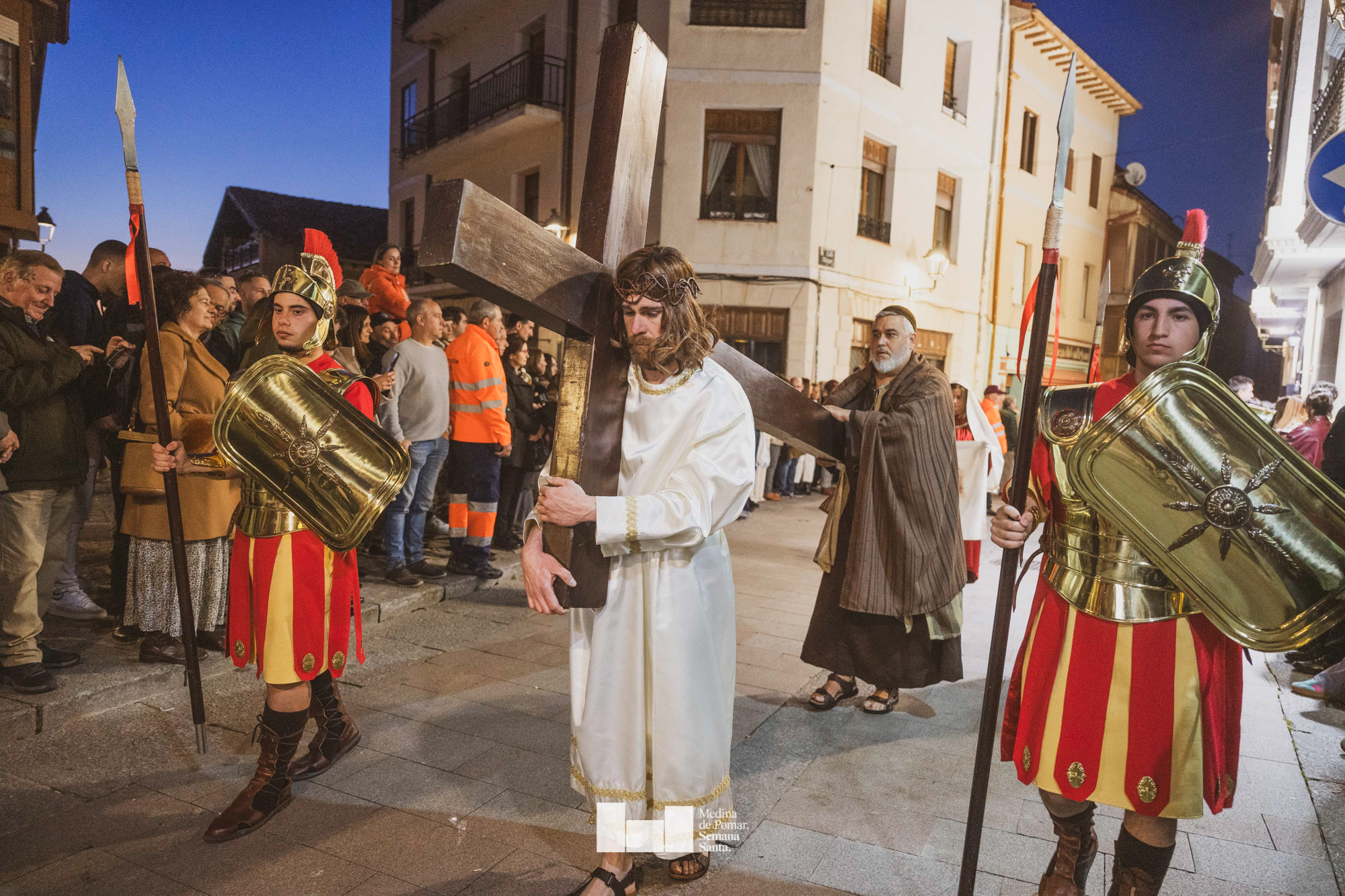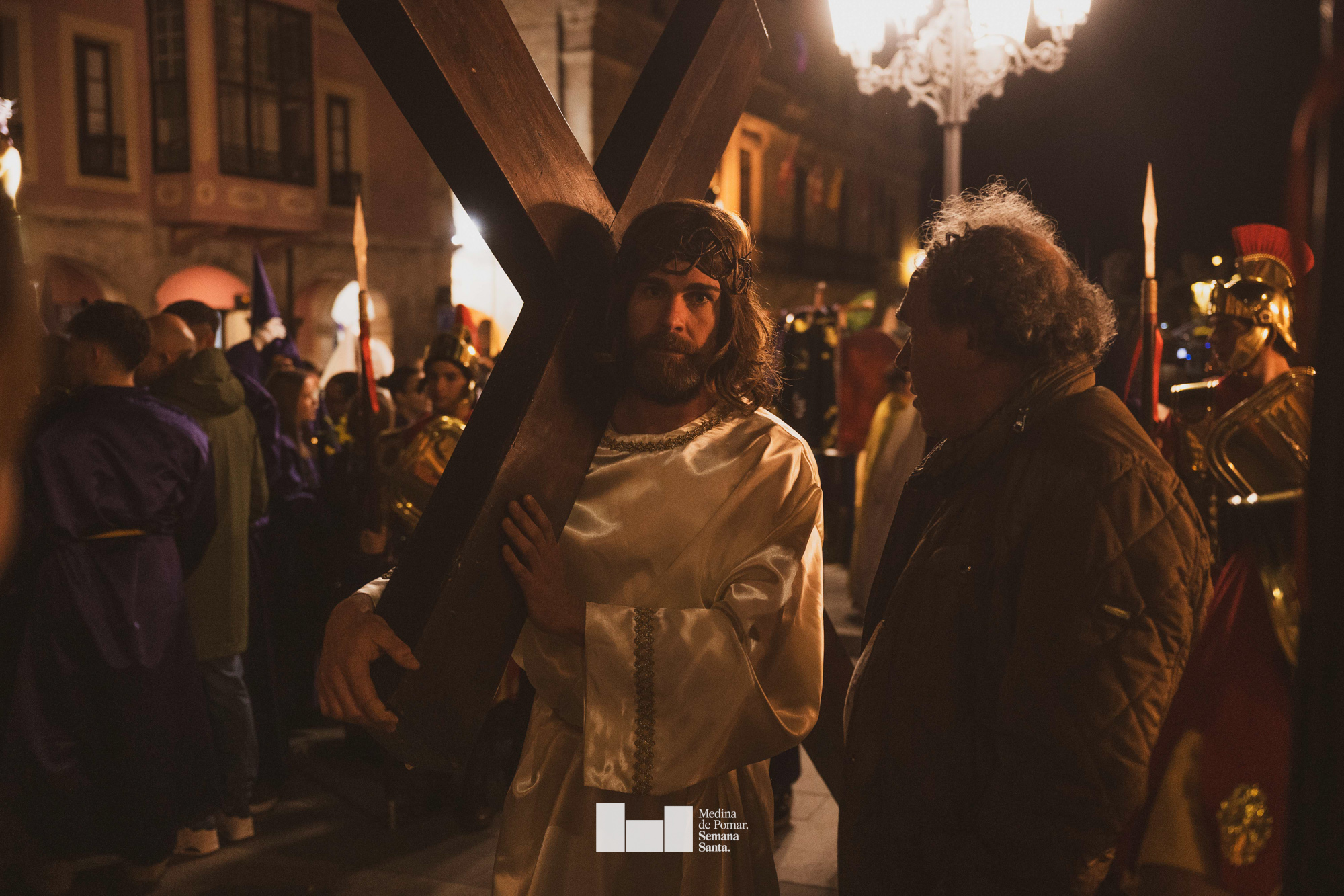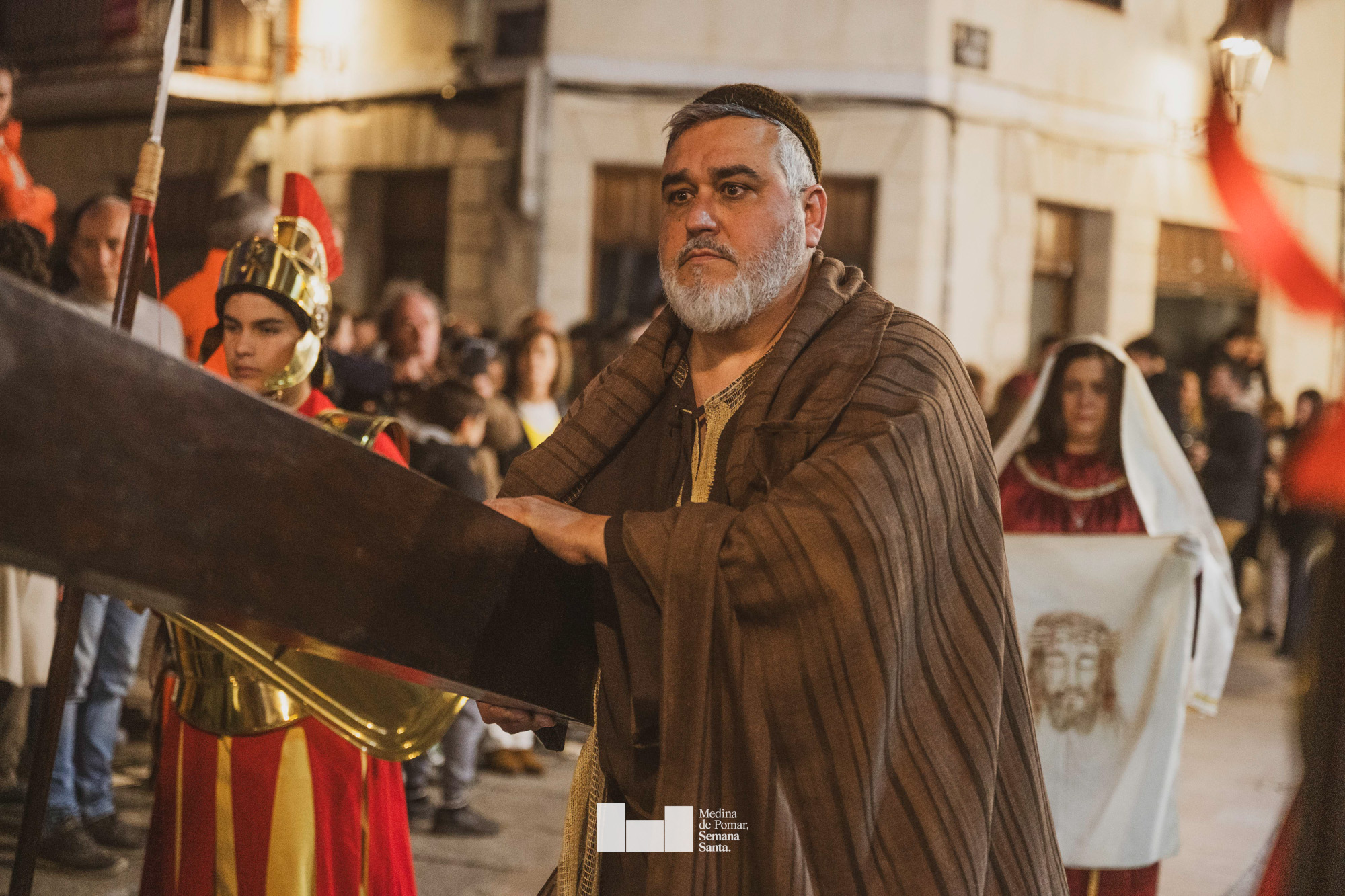 Una multitud de personas se agolpó a lo largo de todo el recorrido en la tarde del Viernes Santo para presenciar el paso de las ocho cofradías con sus pasos así como el Nazareno escoltado por los romanos o la aparición de el nuevo personaje que la procesión ha introducido este año: Simón de Cirene, el Cirineo.