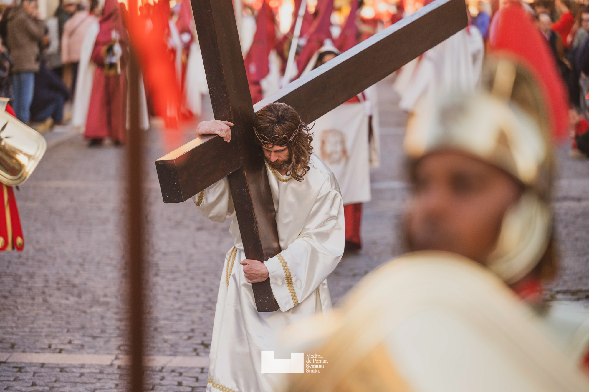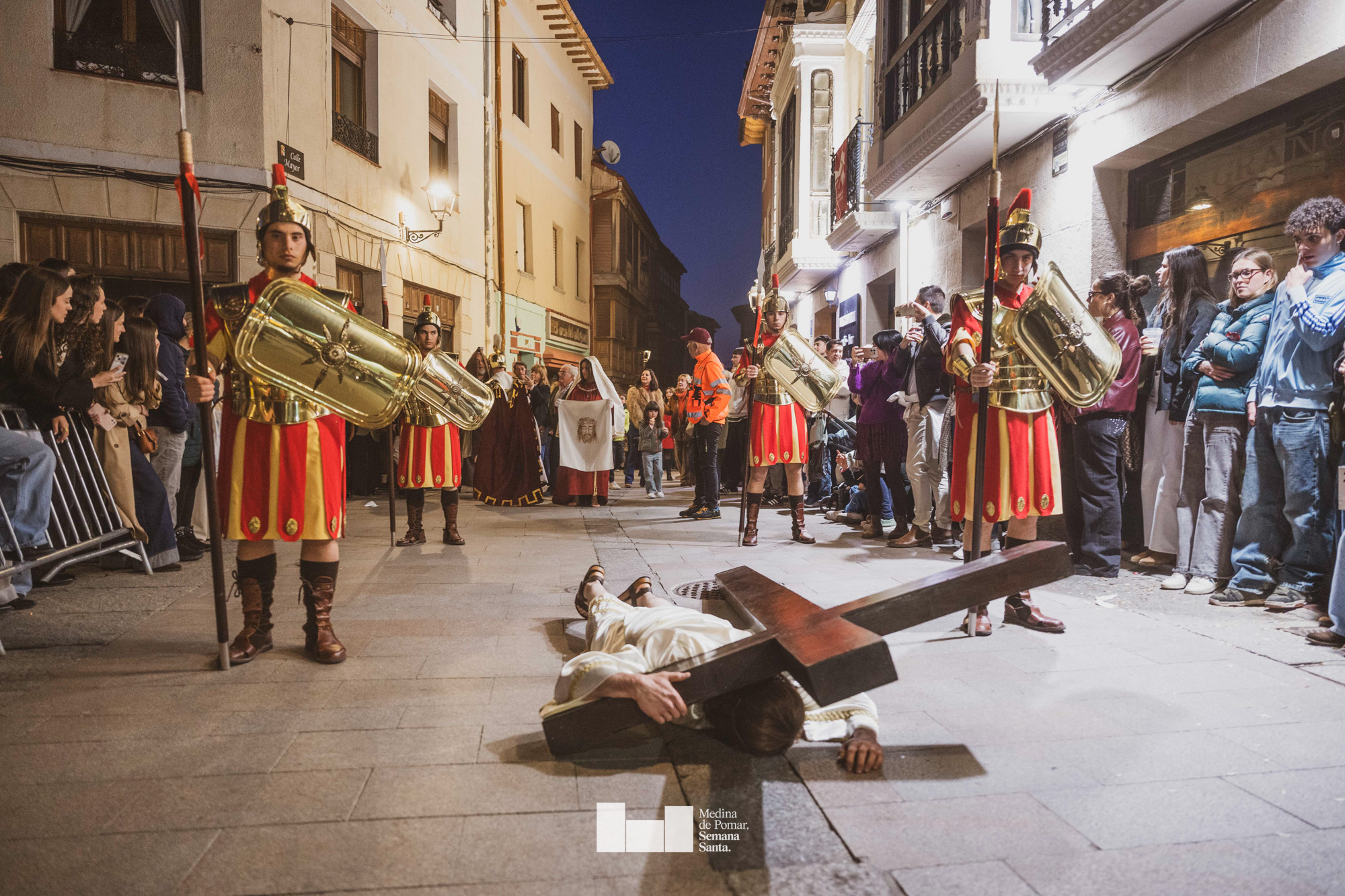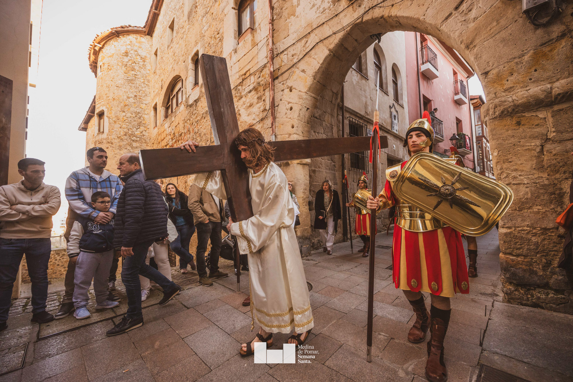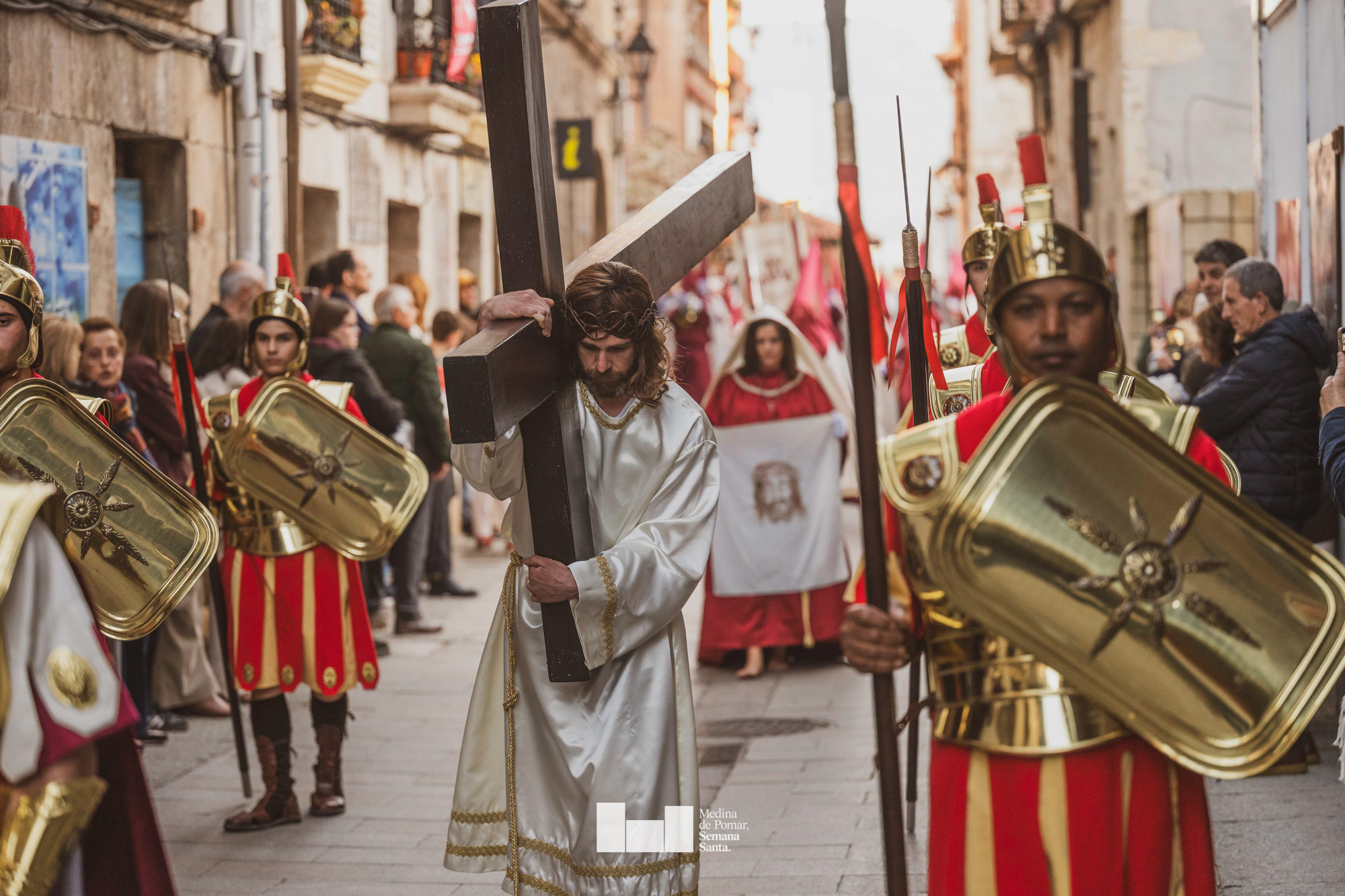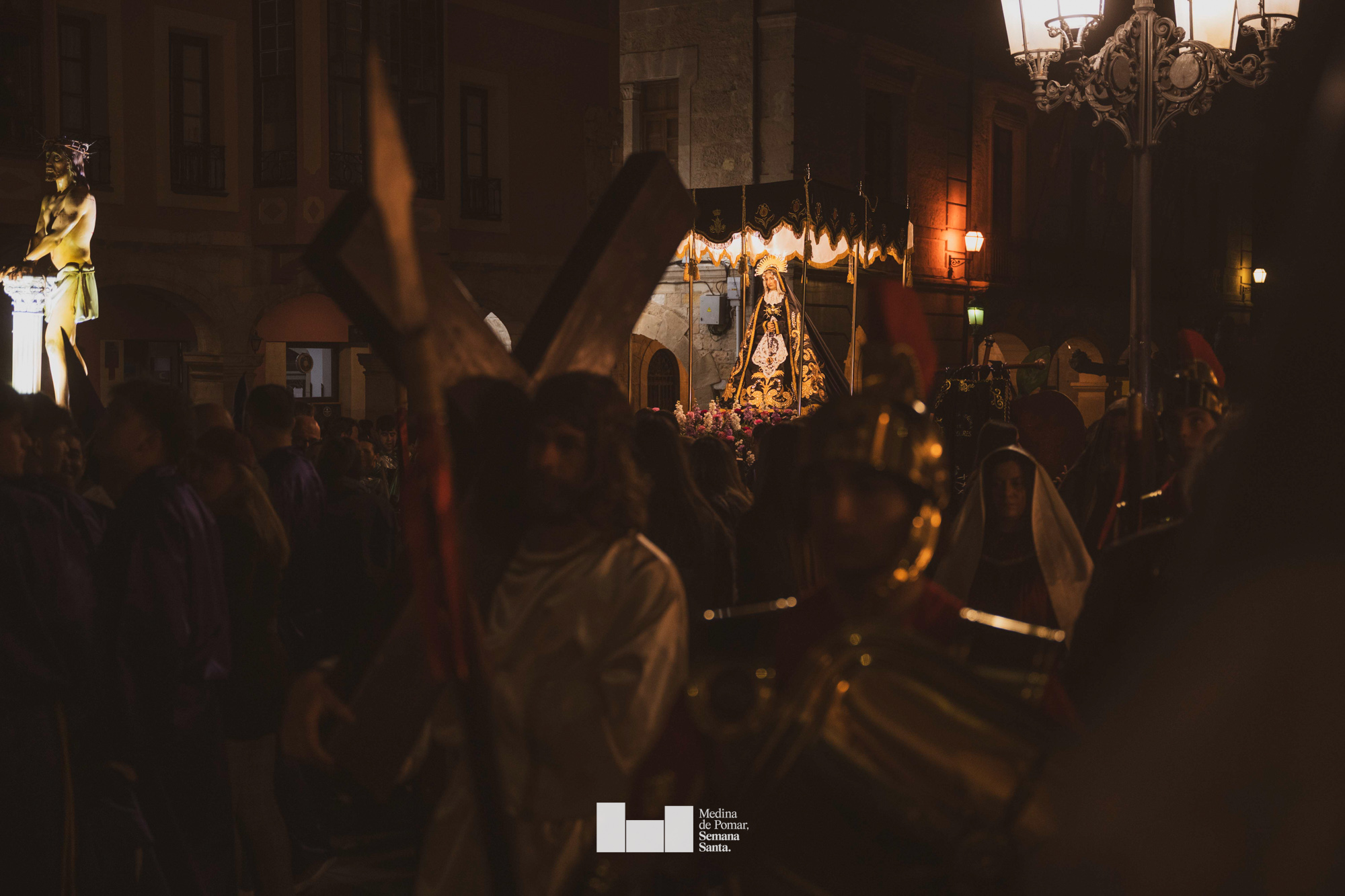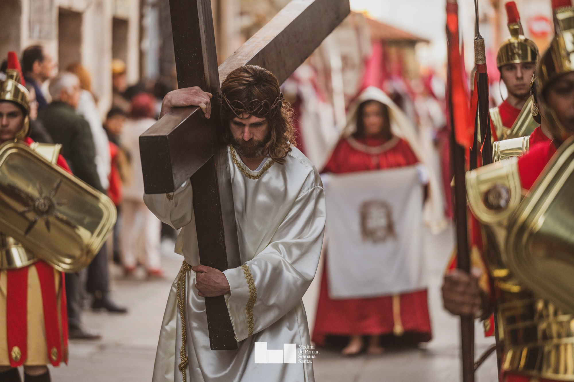 Una multitud de personas se agolpó a lo largo de todo el recorrido en la tarde del Viernes Santo para presenciar el paso de las ocho cofradías con sus pasos así como el Nazareno escoltado por los romanos o la aparición de el nuevo personaje que la procesión ha introducido este año: Simón de Cirene, el Cirineo.