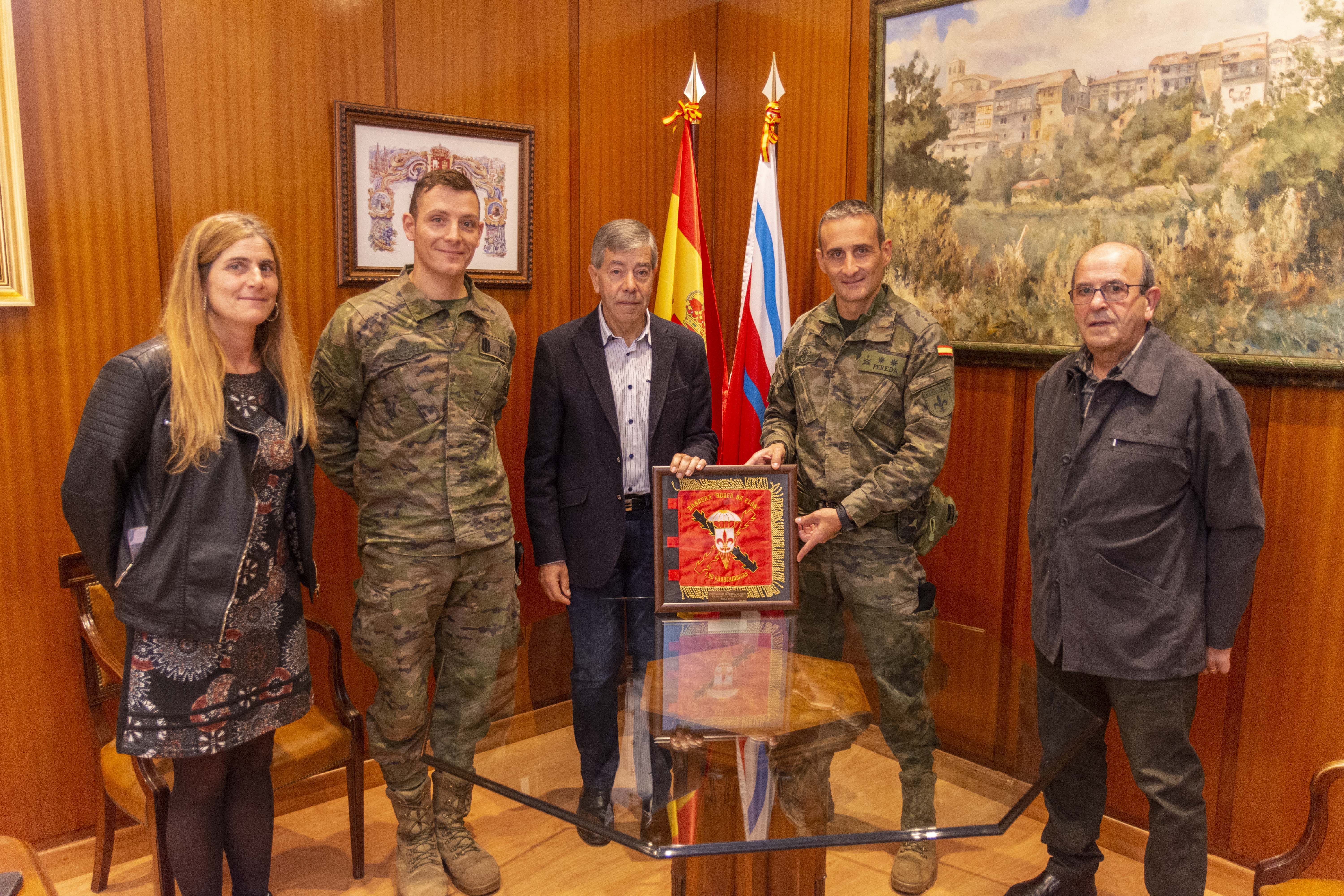 El pasado miércoles, el alcalde de Medina de Pomar, Isaac Angulo, recibió al Teniente Coronel y medinés, Juan José Pereda López y el Cabo, David Capitán, que hicieron entrega al alcalde de una réplica de la Bandera “Roger de Flor” I de Paracaidistas como agradecimiento por el apoyo y colaboración a la hora de organizar los ejercicios.
