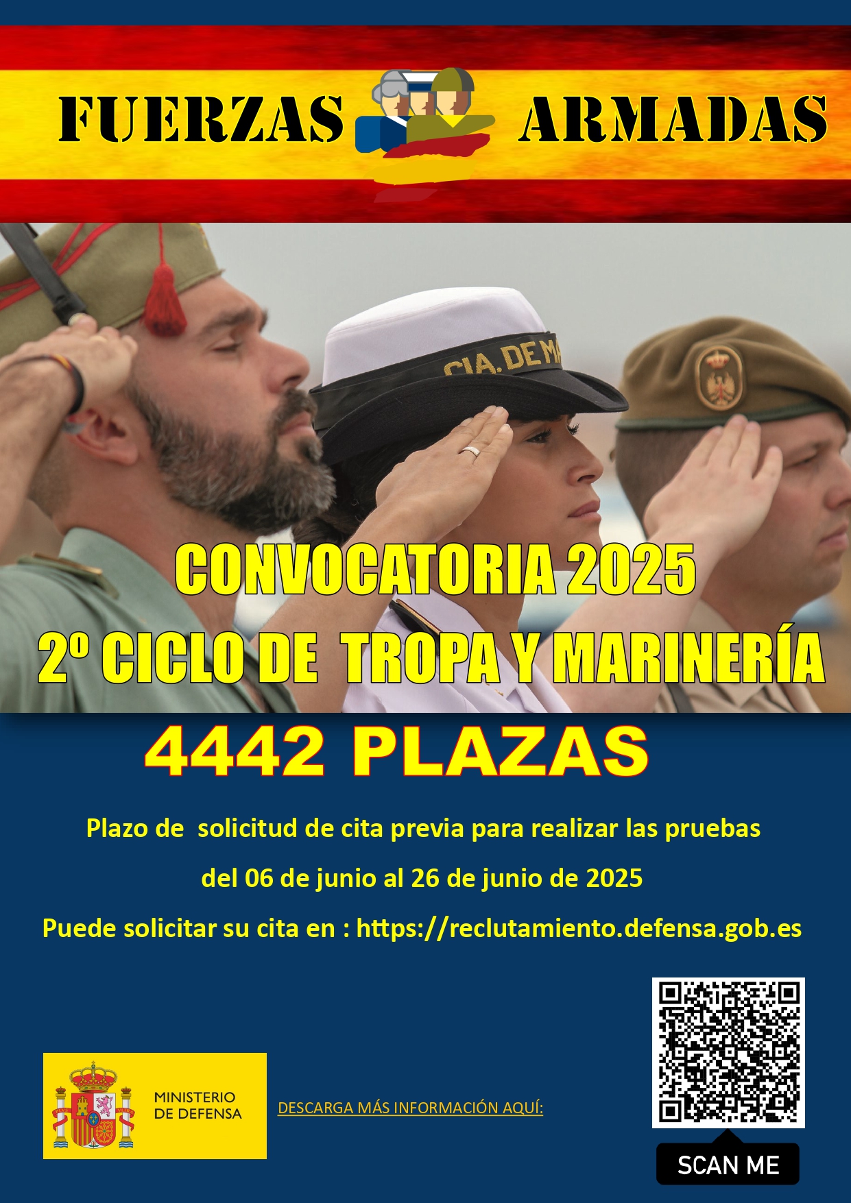 Desde el Área de Reclutamiento de la Subdelegación de Defensa en Burgos, consideramos de interés para su posible difusión entre los jóvenes de edades comprendidas para el día de incorporación al Centro de formación (3 de noviembre de 2025) tener los 18 años y no haber cumplido los 29 años, la oferta de 4.442 plazas de ingreso como Tropa y Marinería Profesional de las Fuerzas Armadas en el 2º Ciclo de la Convocatoria del año 2025. Esta oferta constituye una oportunidad más para la vida profesional de todos aquellos jóvenes burgaleses que pudieran estar interesados/as.