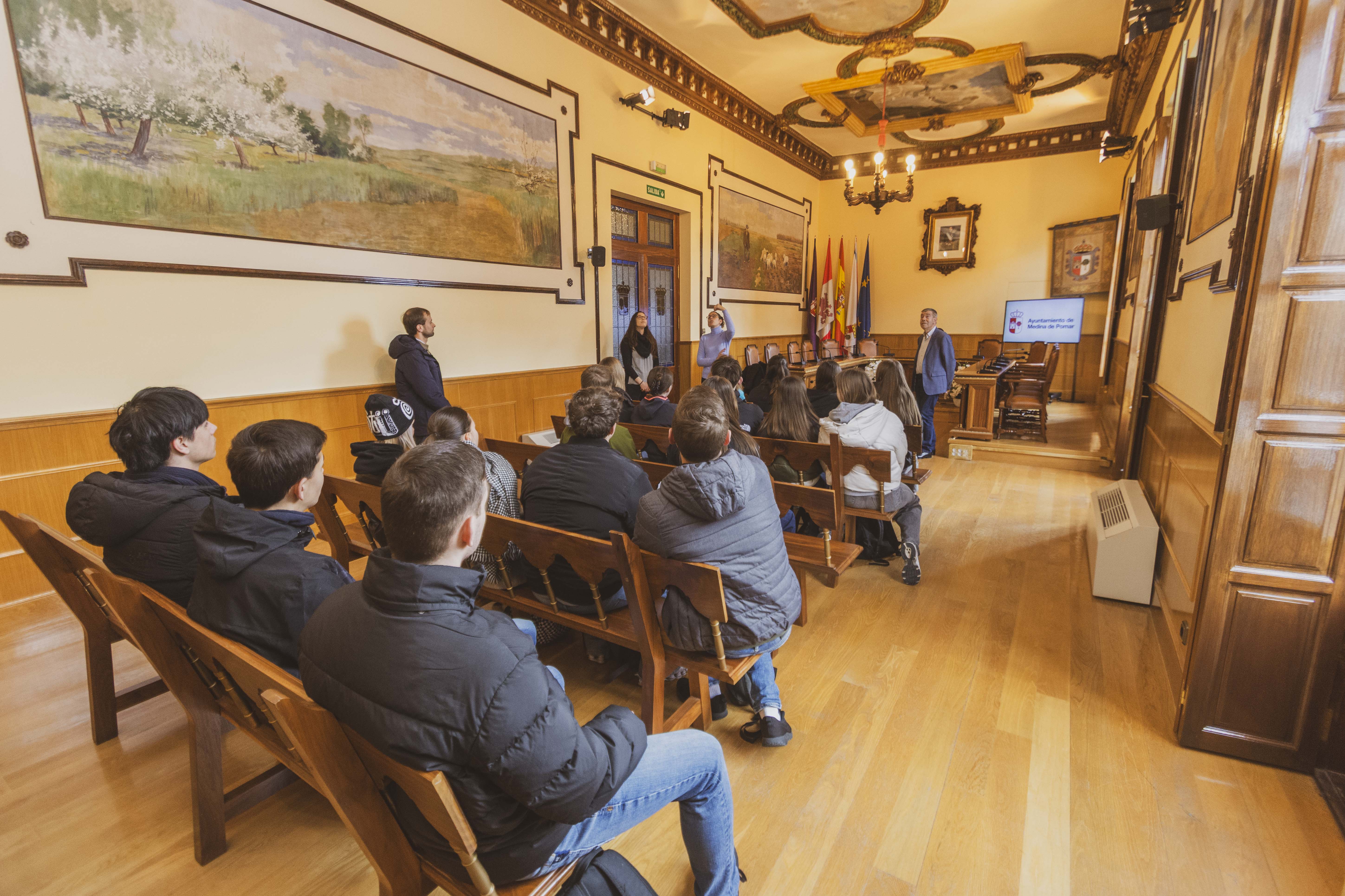 El alcalde de Medina de Pomar, Isaac Angulo, junto con la concejala de cultura y turismo, Nerea Angulo, recibieron este jueves a los 24 alumnos alemanes y sus profesores que han visitado durante estos días la localidad gracias al intercambio lingüístico y cultural que realiza el IES Castella Vetula con el instituto alemán Hariolfgymnasium de Ellwangen (Alemania), en la zona de Stuttgart.