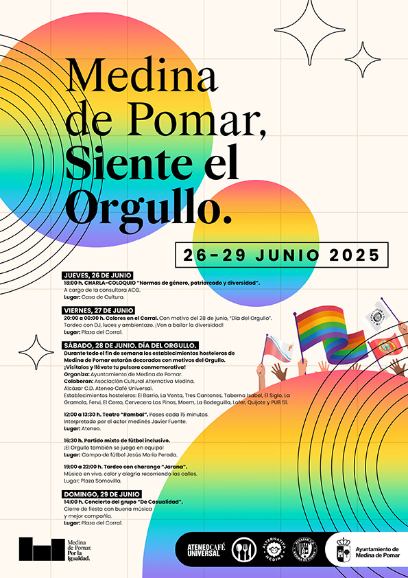 La propuesta nace desde la concejalía de Igualdad y Políticas sociales, con la colaboración de diversos colectivos locales, entre los que destaca especialmente la Asociación Cultural Alternativa Medina, “cuya implicación ha sido fundamental para el diseño y puesta en marcha de esta programación” subraya la edil Verónica Ortega. Añade que “desde la concejalía de Igualdad y Políticas Sociales queremos expresar nuestro agradecimiento al Alcázar C.D., al Ateneo Café Universal, a los establecimientos hosteleros participantes, y a todas las personas que han sumado su esfuerzo para hacer del Orgullo 2025 en Medina de Pomar una celebración abierta, respetuosa y transformadora”.