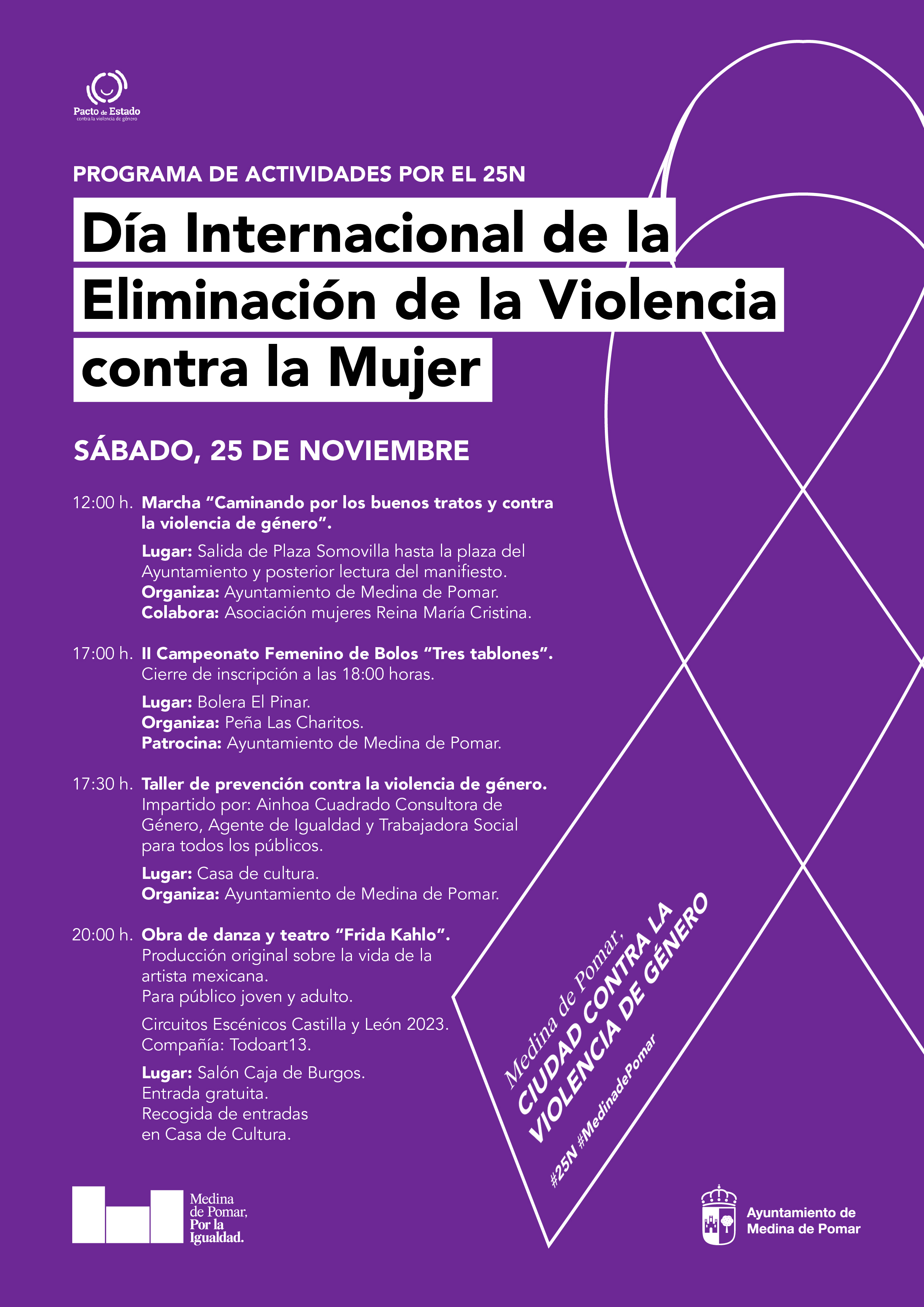 Este 25 de noviembre la ciudad de Medina de Pomar vuelve a subrayar su NO a la violencia de género con una programación de actividades que comenzará a las 12 del medio día con la marcha ‘Caminando por los buenos tratos y contra la violencia de género’.