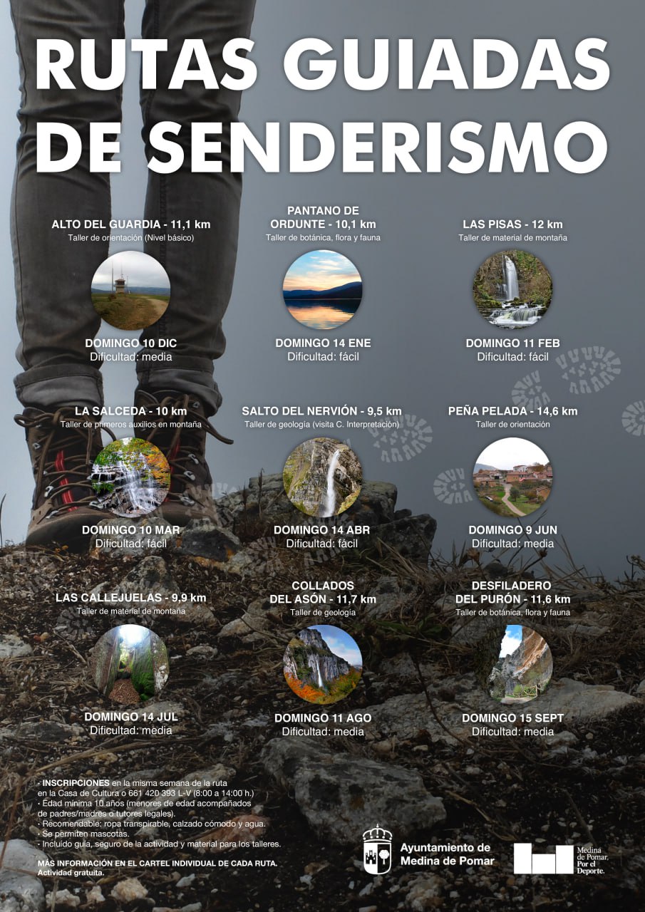 Con la llegada del nuevo año el Ayuntamiento de Medina de Pomar, a través de su concejalía de deportes, quiere establecer un calendario anual con diferentes actividades en las que podrán participar desde jóvenes a mayores. De esta forma como novedad, desde el área de deportes se da un paso más hacia una programación estable gracias a la que en todos los meses se ofrecerán Masterclass de actividades deportivas, rutas de senderismo con talleres y salidas de marcha nórdica.